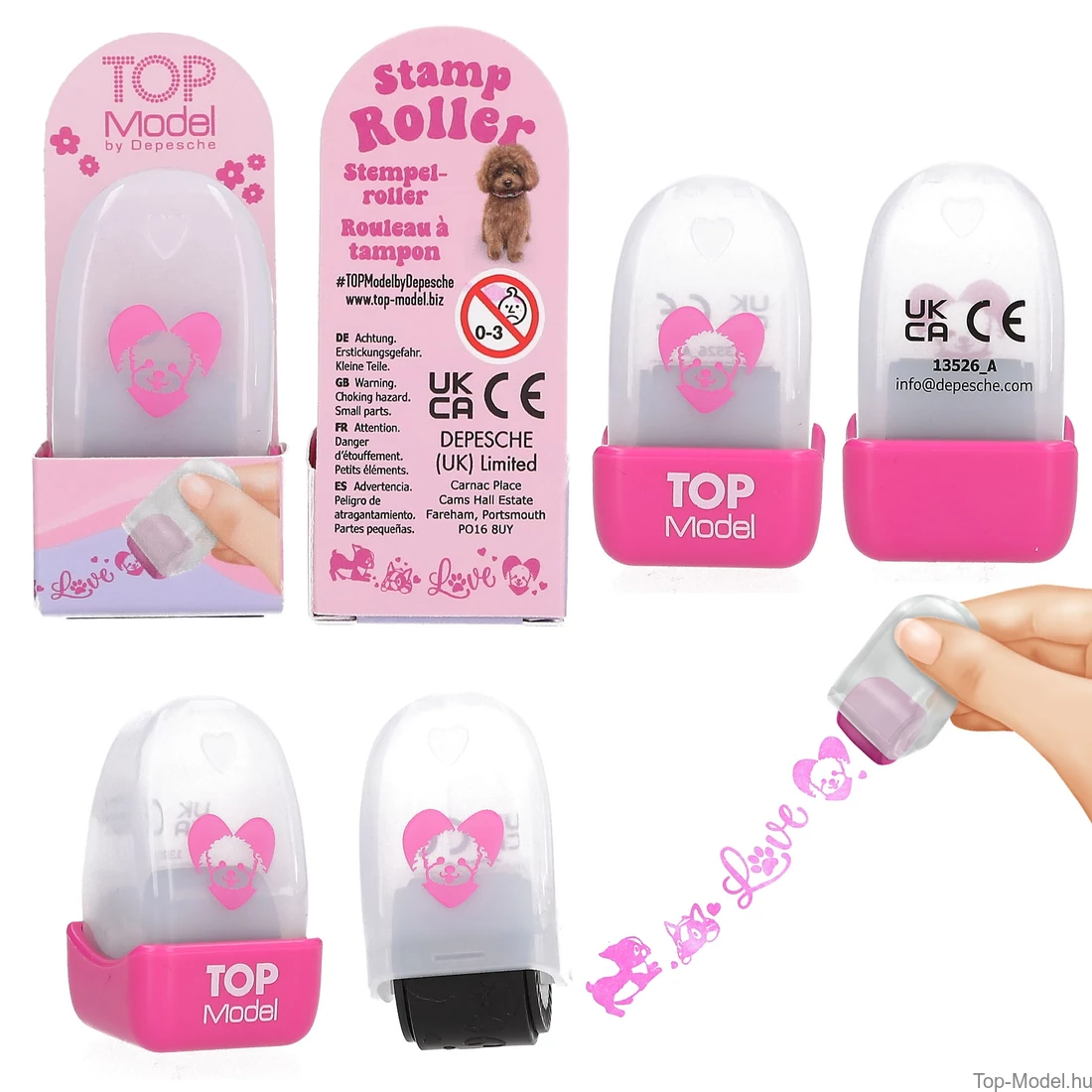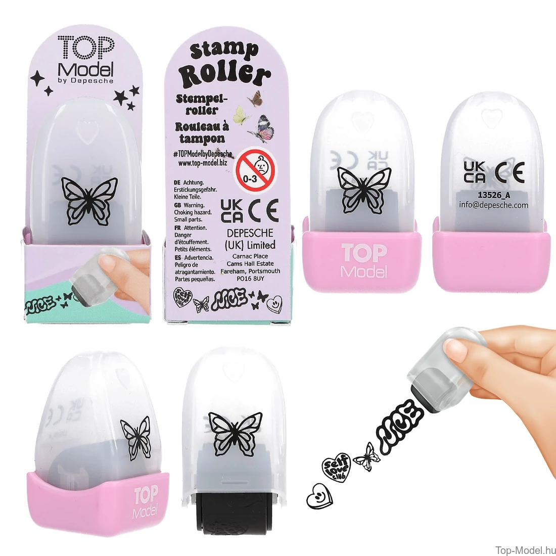 A TOPModel bélyegzőhengerek négy színben kaphatók, különböző feliratokkal és motívumokkal. Fekete színben NICE, szívekkel és pillangókkal, lila színben HAPPY és cicákkal, kékben menő trendi ikonokkal, rózsaszínben pedig LOVE és kiskutyákkal. Papír sodrásához és díszítéséhez. Nincs szükség tintapárnára, a szín a tekercsbe van integrálva.