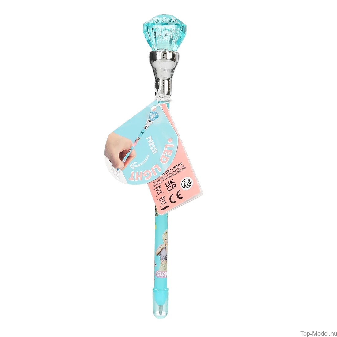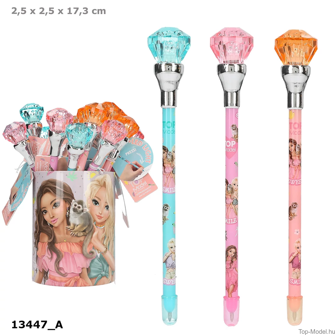 A TOPModel golyóstollak gyémánt felsőrészei világítanak, ha írsz vele. Türkiz, rózsaszín és kajszibarack színekben, színben passzoló gyémánt borításokkal, menő modellmotívumokkal és gyümölcsös, nyárias állatmintákkal. A golyóstollak kék tintával írnak. Az elemeket a csomag tartalmazza és nem cserélhető.