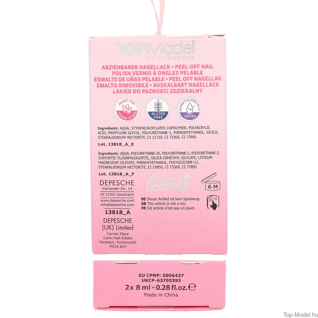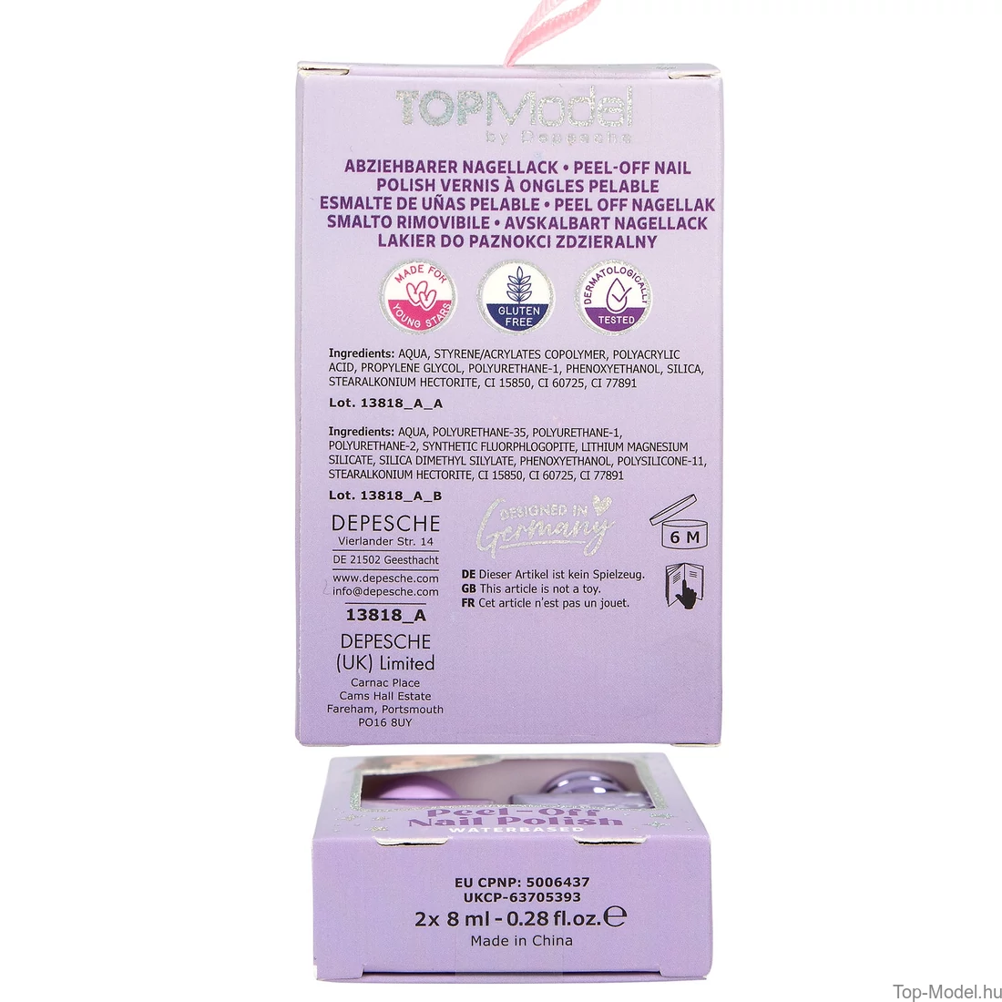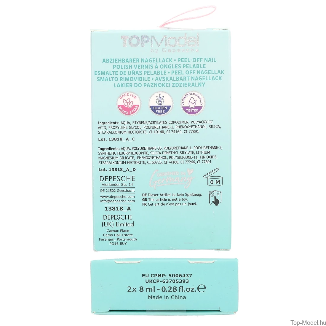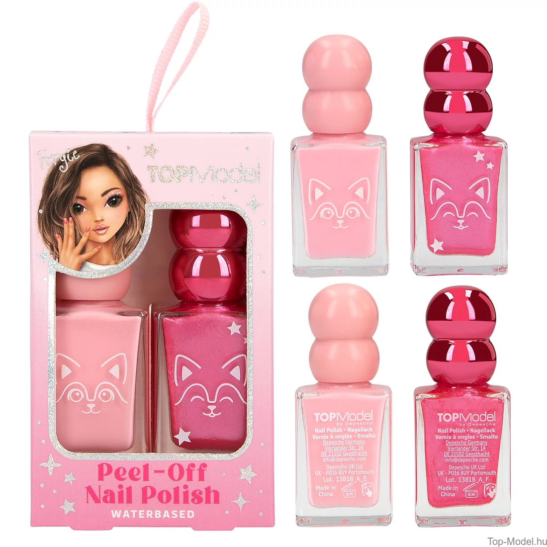 : VÍZ, SZTIROL/AKRILÁT KOPOLIOMER POLIAKRILSAV, PROPILÉN-GLIKOL, POLIURETÁN-1, FENOXIETANOL, SZILÍCIUM-KIVONAT, SZTEARALKÓNIUM-HEKTORIT, CI 11710, CI 73360, CI 77891 Nagellack Sötét Rózsaszín Schimmer : VÍZ, POLIURETÁN-35, POLIURETÁN-1, POLIURETÁN-2, SZINTETIKUS FLUORFLOGOPIT, SZILÍCIUM-DIMETIL-SZILILÁT, LÍTIUM-MAGNÉZIUM-SZILIKÁT, FENOXIETANOL, POLISZILIKON-11, SZTEARALKÓNIUM-HEKTORIT, CI 15850, CI 73360, CI 77891 Nagellack Menta : VÍZ, SZTIROL/AKRILÁTOK KOPOLIOMER, POLIAKRILSAV, PROPILÉN-GLIKOL, POLIURETÁN-1, FENOXIETANOL, SZILÍCIUM-DIMETIL-SZILILÁT, SZTEARALKÓNIUM-HEKTORIT, CI 19140, CI 74160, CI 77891 Nagellack Mint Schimmer : VÍZ, POLIURETÁN-35, POLIURETÁN-1, POLIURETÁN-2, SZINTETIKUS FLUORFLOGOPIT, SZILÍCIUM-DIMETIL-SZILILÁT, LÍTIUM-MAGNÉZIUM-SZILIKÁT, FENOXIETANOL, POLISZILIKON-11, ÓN-OXID, SZTEARALKÓNIUM-HEKTORIT, CI 60725, CI 74160, CI 77266, CI 77891