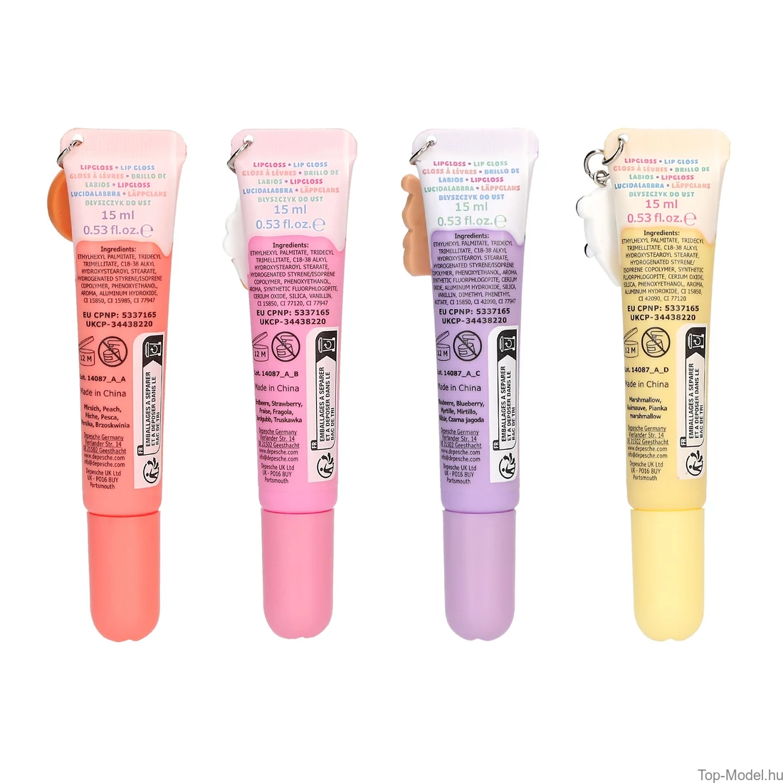 A TOPModel négyféle szájfénye gyönyörűen csillogó ajkakat kölcsönöz. Kapható barackos-barack illatú, rózsaszínes-eper illatú, lilás-áfonyás és sárga-pillecukor illatú.  Minden tubushoz egy imádnivaló medál tartozik. Tartalom: 15 ml tubusonként; gluténmentes, bőrgyógyászatilag tesztelt, fiatal sztároknak készült.
